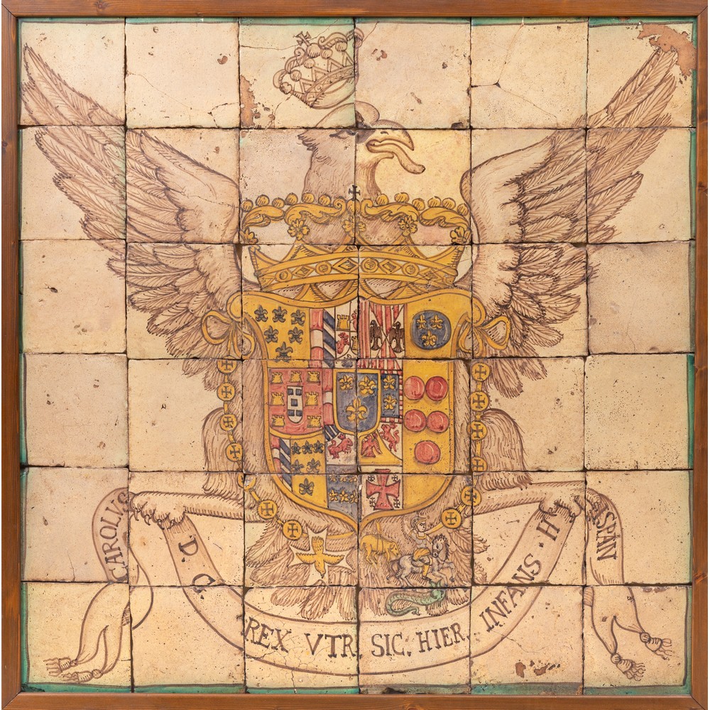 Pannello realizzato con mattonelle in ceramica decorata e smaltata raffigurante stemma araldico.