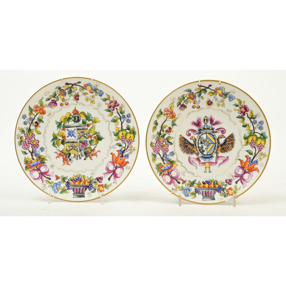 Coppia di piatti in porcellana a decori floreali, ghirlanda centrante stemma araldico.
