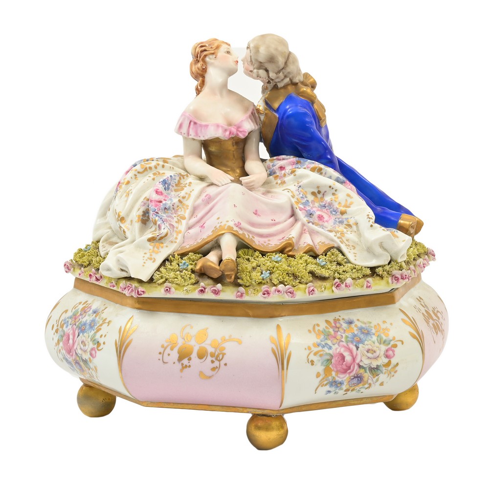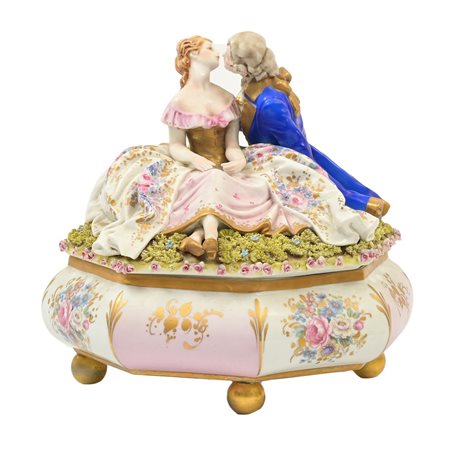 Scatola portagioie in porcellana di Saxe decorata in oro a motivi floreali, sul coperchio dama e cavaliere in scena galante.