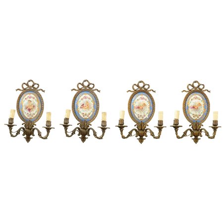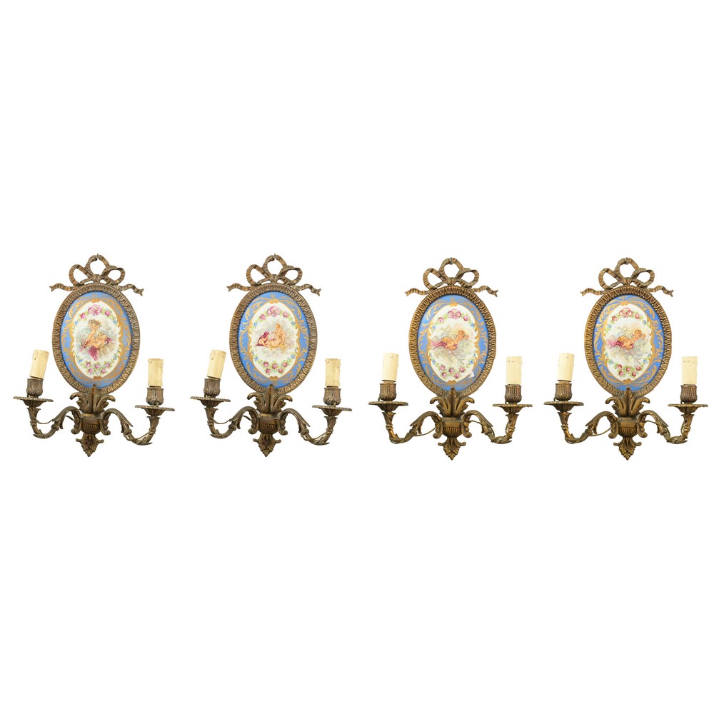 Quattro applique in bronzo con medaglioni in porcellana di Sevres dipinti a mano.