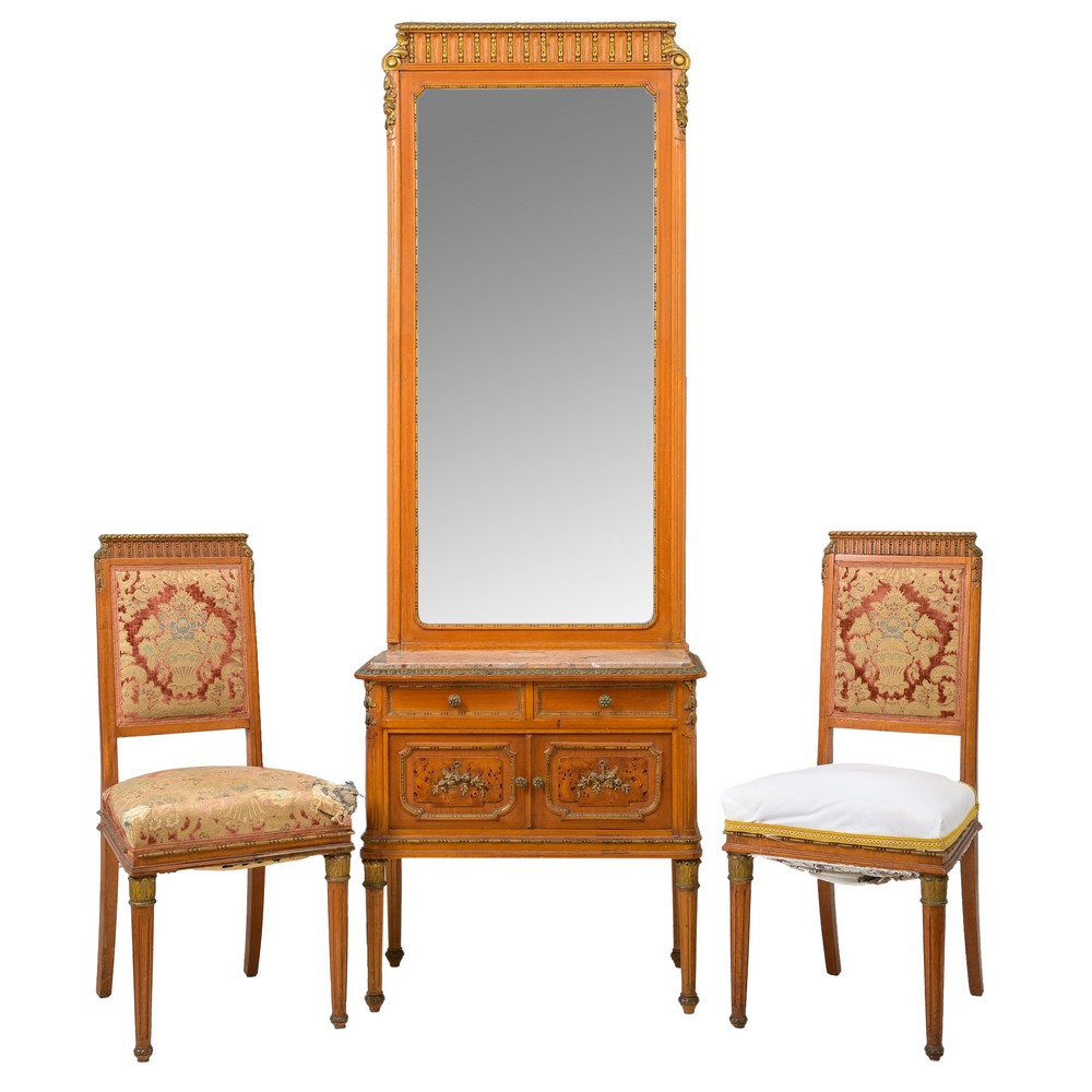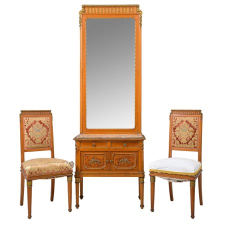 PICCOLO CASSETTONE in legno di acero e lumeggiature in oro, piano in marmo e due sedie..