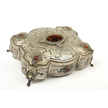 PORTAGIOIE di forma sagomata in metallo riccamente sbalzato e cesellato a motivo floreale e fogliaceo con applicazioni di pietre dure (una mancante) e sulla parte superiore applicazione di finta tartaruga.