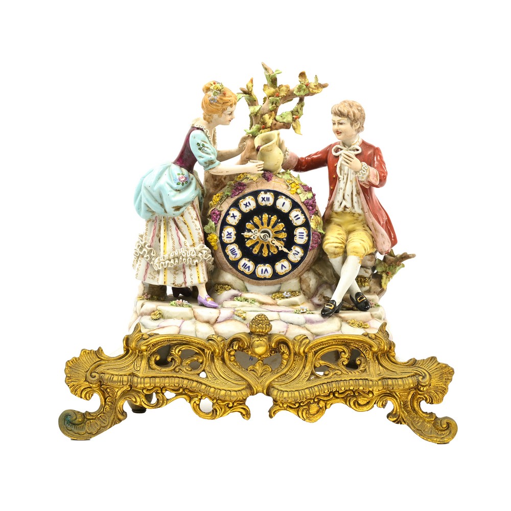 OROLOGIO in porcellana dipinta raffigurante scena galante con base in bronzo.