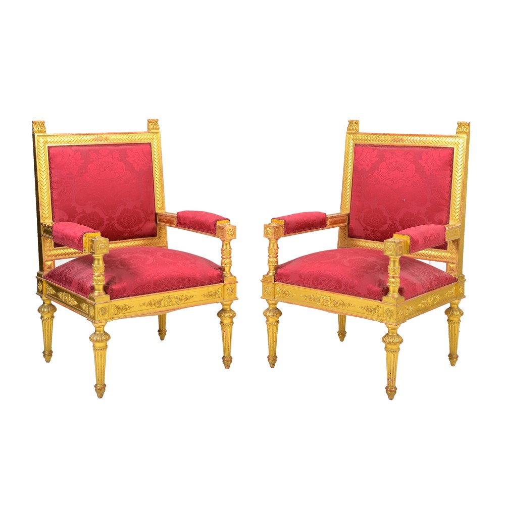 Coppia di poltrone Impero in legno intagliato e dorato, con imbottitura in damasco rosso.