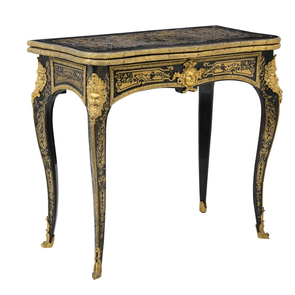 TAVOLO da gioco stile Boulle in legno ebanizzato e applicazioni in ottone, elementi in bronzo.