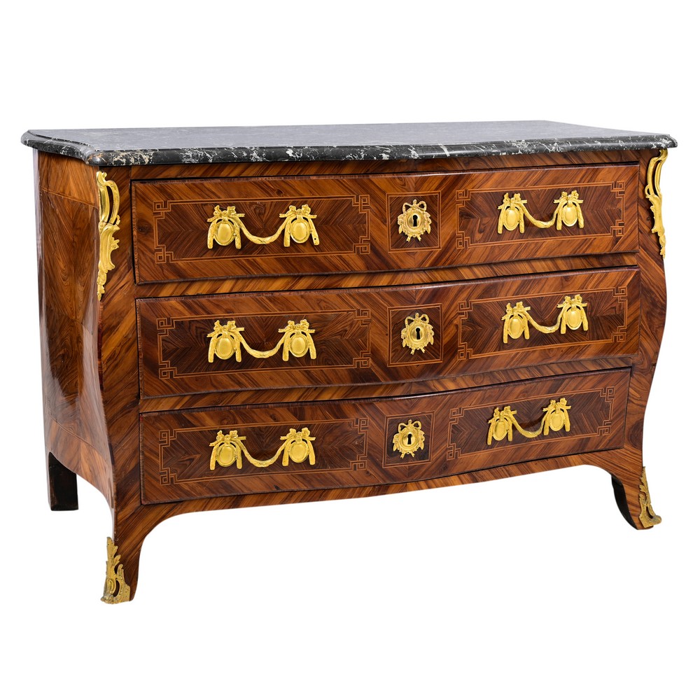 Cassettone Luigi XV a tre cassetti lastronato bois de violette, mogano, bois de rose, con ornamenti in ottone dorato al mercurio, fronte e fianchi mossi, piedi mossi con decori in bronzo dorato, piano in marmo grigio.