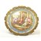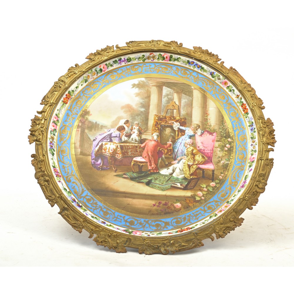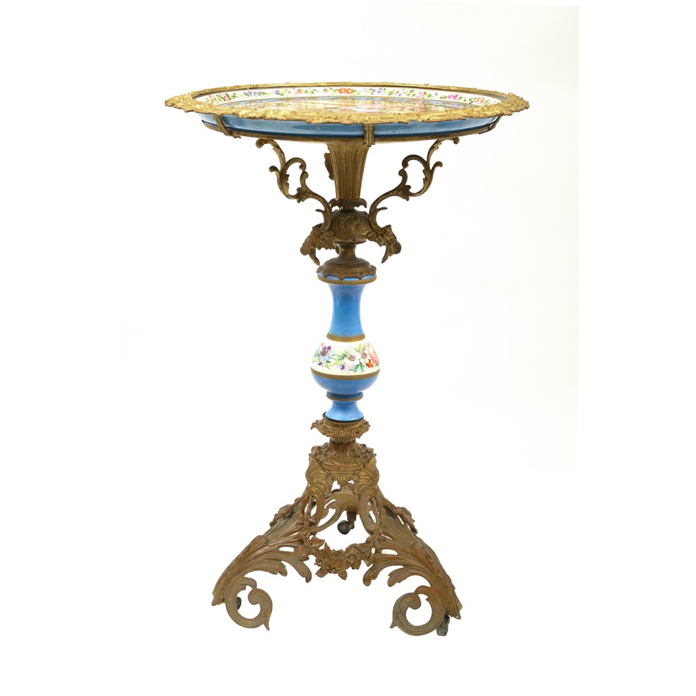 Gueridon con struttura in bronzo dorato ed elementi in porcellana di Sevres policroma, piano in porcellana di Sevres dipinta a mano raffigurante "Scena nobiliare con scuola di pittura" (rottura nella porcellana del fusto).