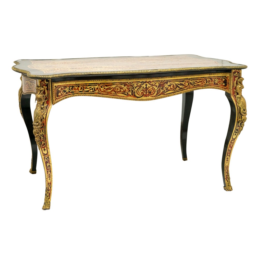 Tavolo scrittoio con cassetto centrale, da centro in legno ebanizzato riccamente intarsiato in rame. Guarniture e applicazioni bronzo.