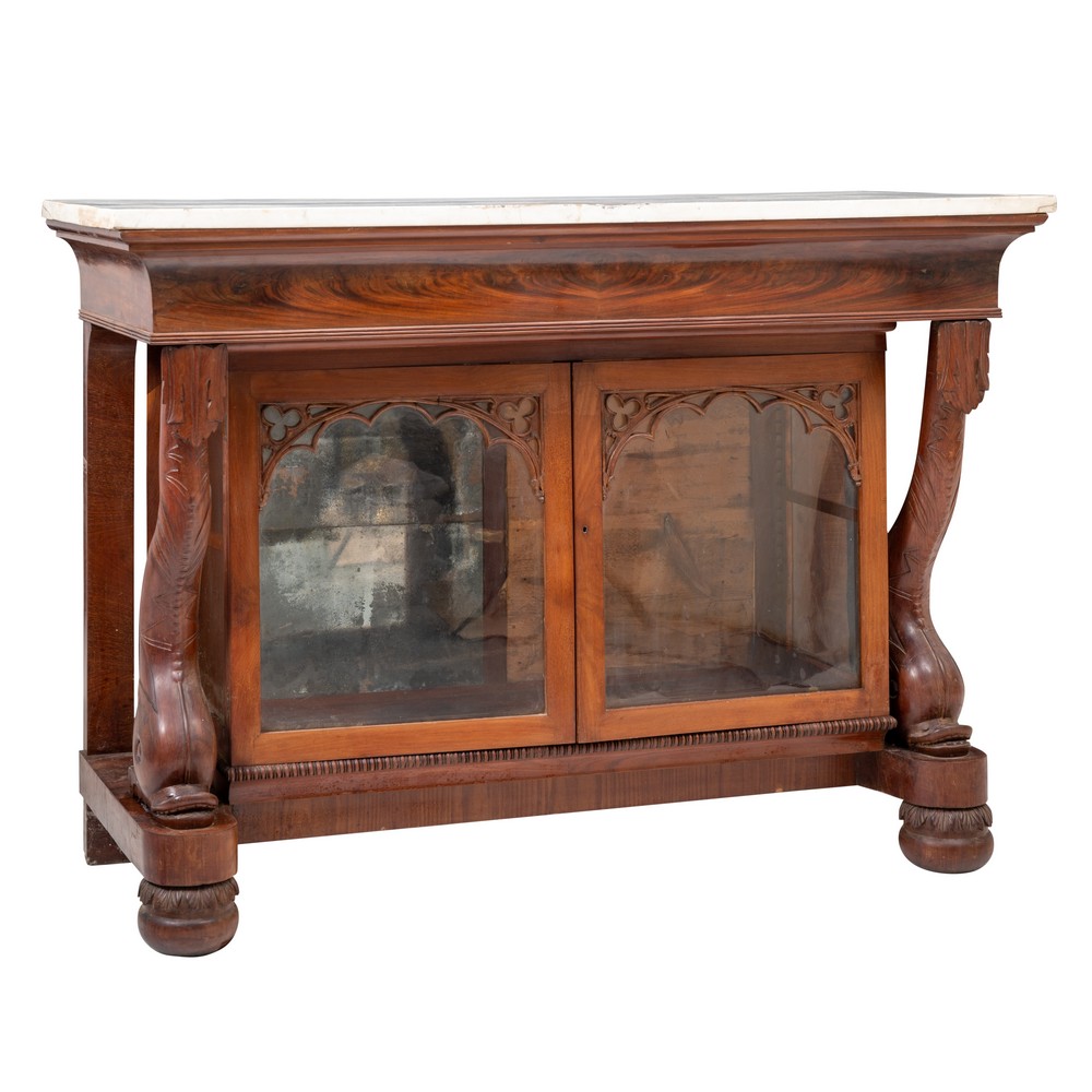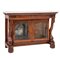 Consolle Impero in legno di noce sorretta da piedi a forma di delfini con vetrina nella parte sottostante, piano in marmo.