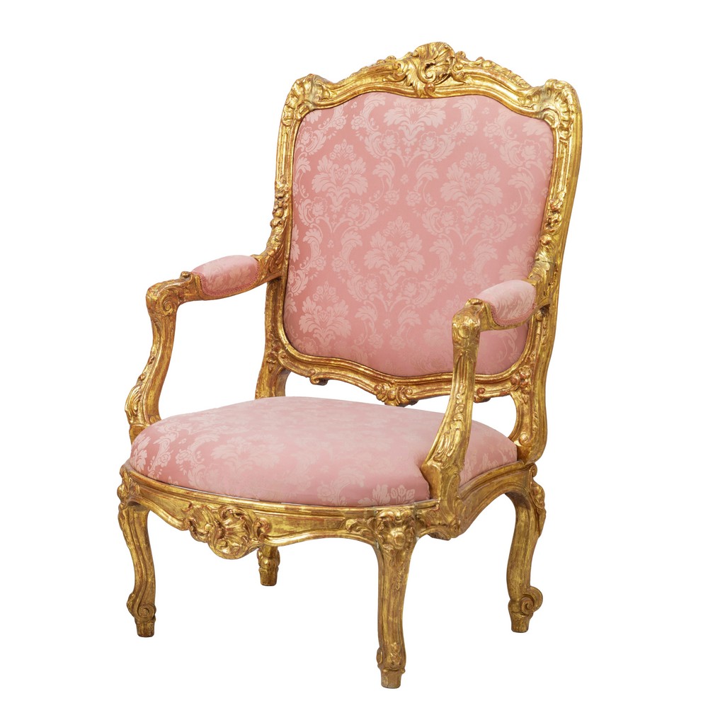 Poltrona stile Luigi XV in legno dorato con seduta e spalliera in tessuto damascato rosa.