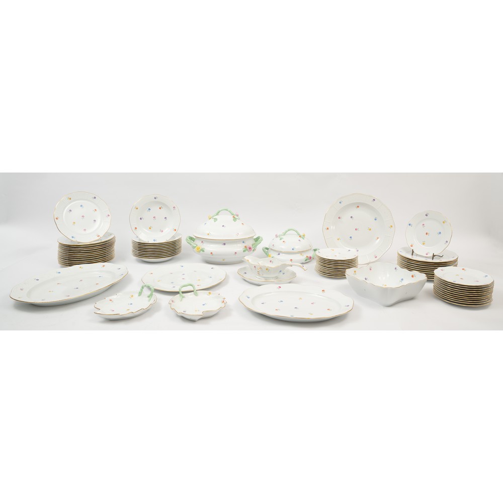 Servizio di piatti in porcellana composto da: 24 piatti piani, 12 piatti fondi, 12 piatti frutta, 12 piatti dolce, insalatiera, legumiera, salsiera, zuppiera, 2 raviere e 4 piatti da portata.