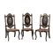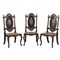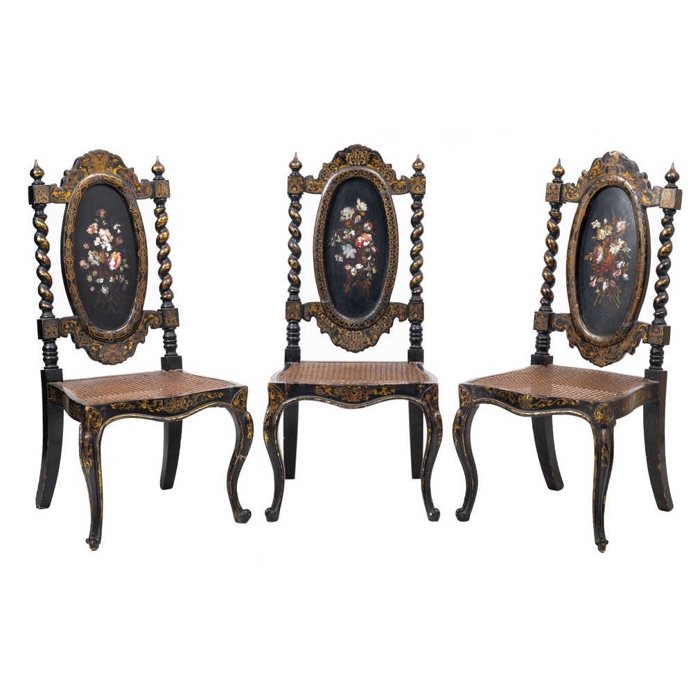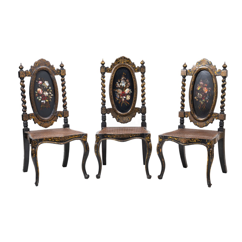 SEI SEDIE di gusto eclettico in legno laccato e dipinto con tarsie in madreperla, lumeggiature in oro, seduta in finocchino.