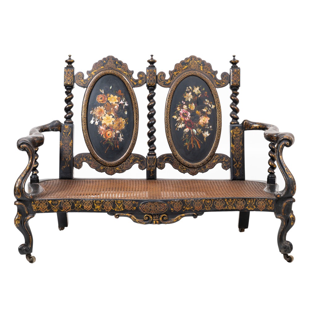 DIVANO di gusto eclettico in legno laccato e dipinto, tarsie in madreperla, lumeggiature in oro, seduta in finocchino con cuscino in tessuto damascato nei toni del rosso.
