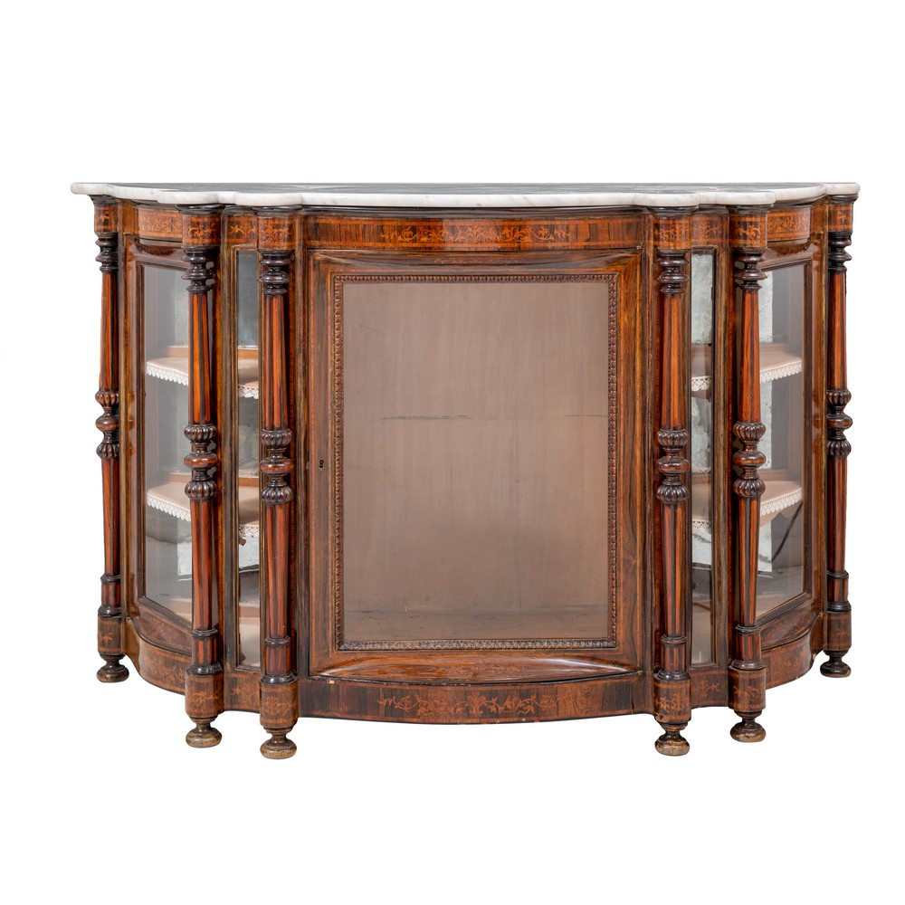 Etagere di forma sagomata in legno di palissandro, legno di rosa e tarsie in bosso con piano in marmo bianco di Carrara.