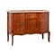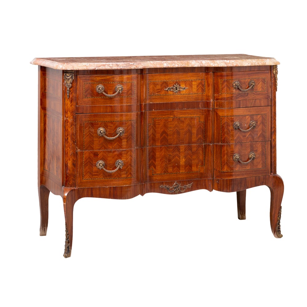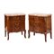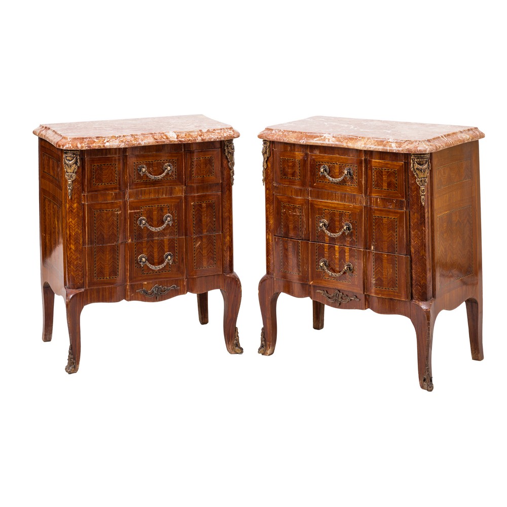 CASSETTONE E COPPIA DI COMODINI in legno di noce con marchetterie e perfili in bosso e palissandro, maniglie ed elementi in bronzo dorato, piano in marmo rosso di Francia.