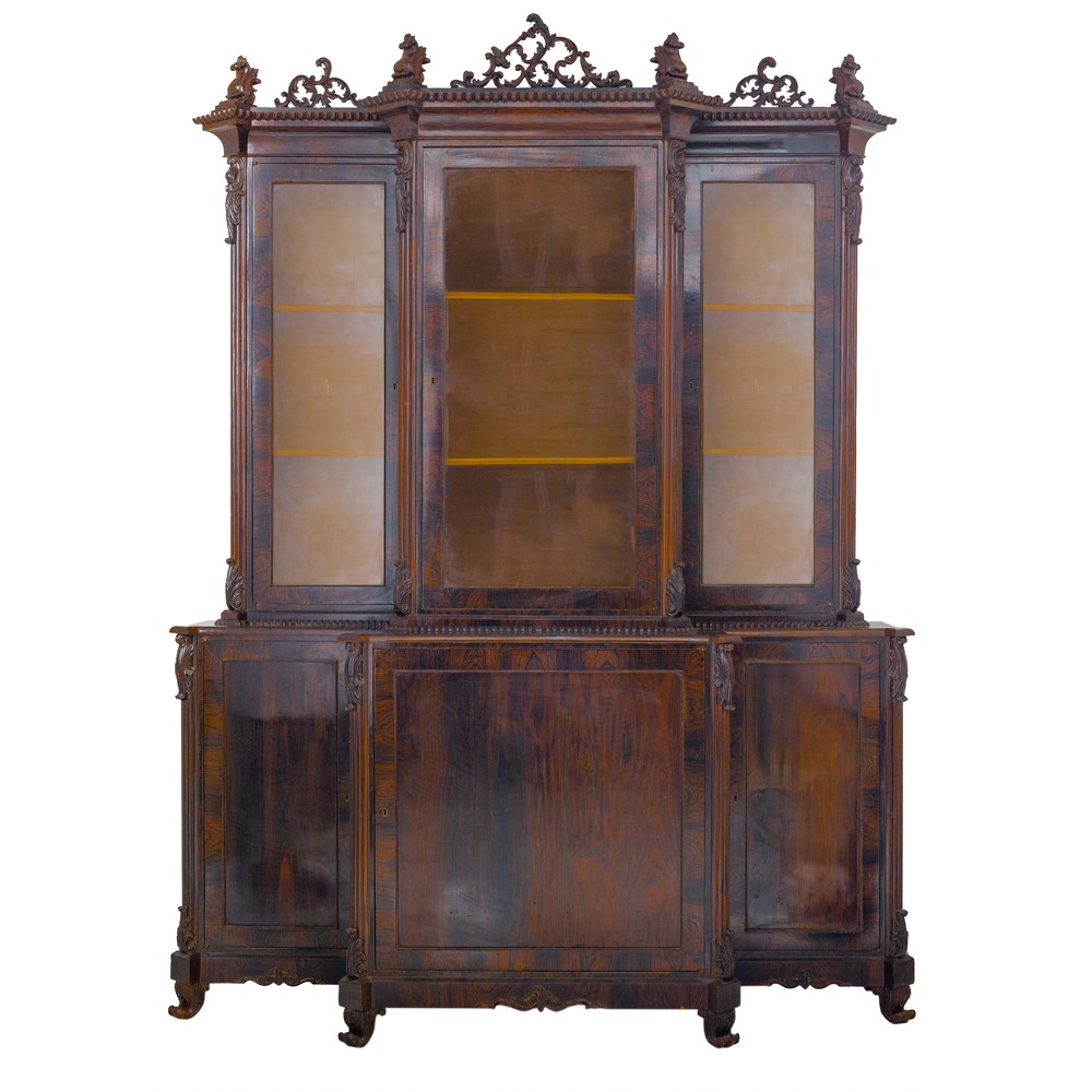 Imponente credenza Luigi Filippo con vetrina a tre ante nella parte sottostante e tre ante a vetro nella parte sovrastante in legno palissandro.