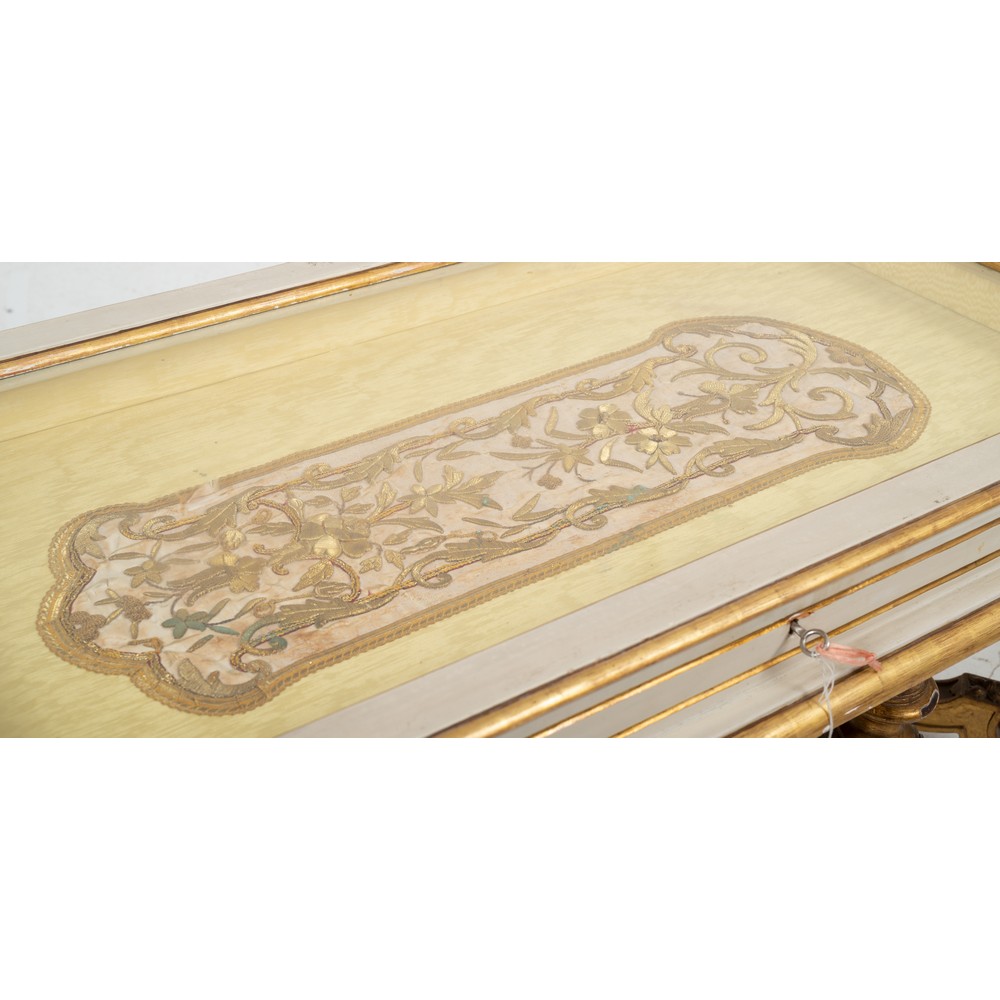 TAVOLINO/BACHECA in legno laccato e dorato con all'interno drappo in tessuto con filigrana in oro.
