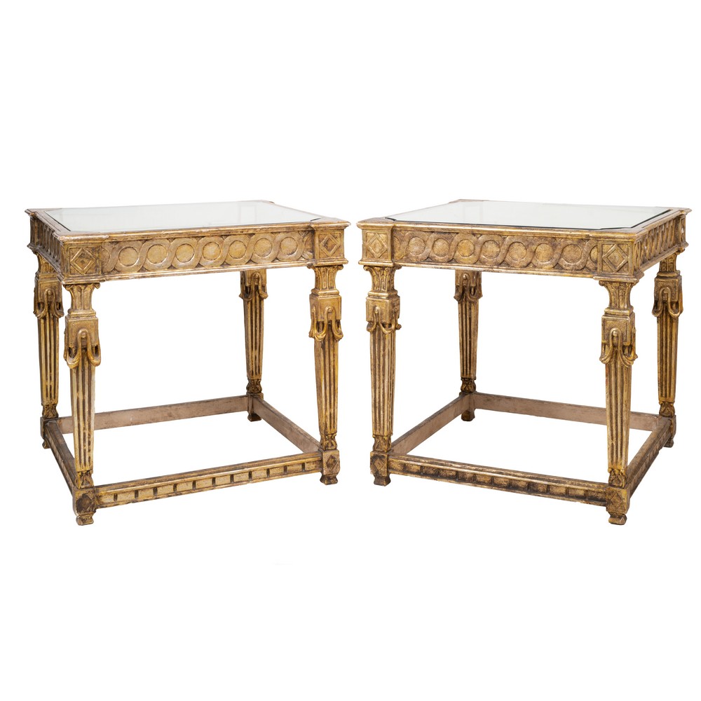 COPPIA TAVOLI espositori di gusto eclettico in legno dorato.
