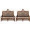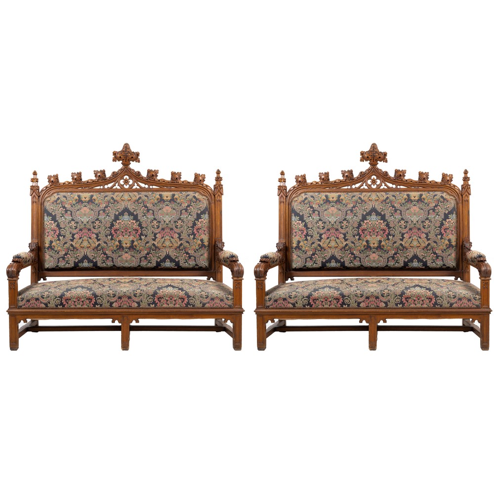 Coppia divani di gusto neogotico in legno di rovere.