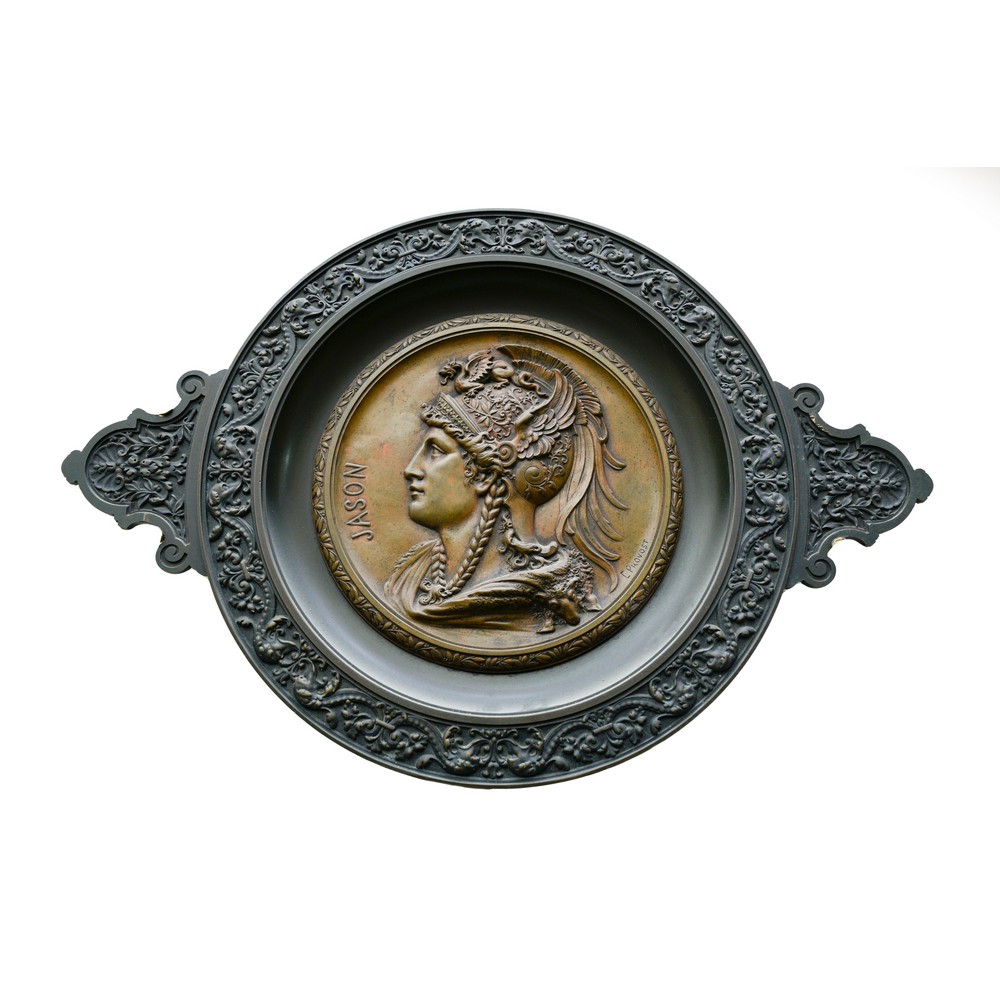 Centrotavola in bronzo con al centro bassorilievo raffigurante "Mezzobusto femminile".
