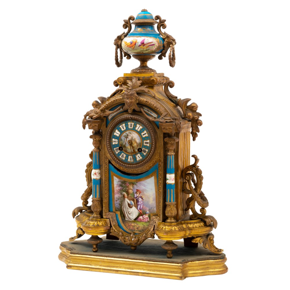 Orologio a tempietto in metallo dorato con placche din porcellana di Sevres, base in legno dorato.
