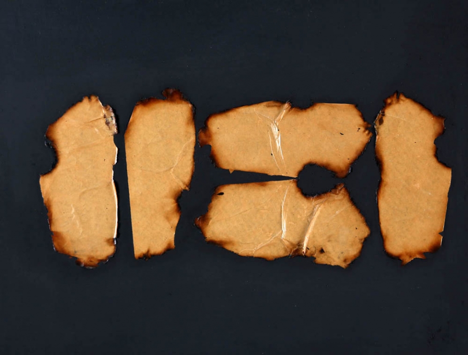 TURI SIMETI 1929 " Composizione ", 1961 Olio e carte bruciate su tela, cm. 64 x 80 Firmato e datato sul retro Autentica Archivio Turi Simeti su fotografia Etichetta Galleria d'Arte Bergamo sul retro Prov. Collezione Privata