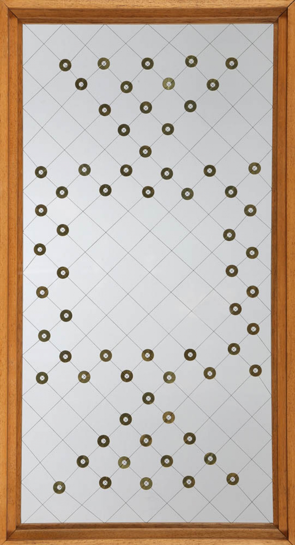 MANFREDO MASSIRONI 1937 - 2011 " Struttura visiva ", 1961 Rondelle in ottone, filo di cotone, vetro e legno, cm. 65 x 35 x 5 Firmato e datato a destra Autentica di Franca Massironi su fotografia Prov. Collezione Privata