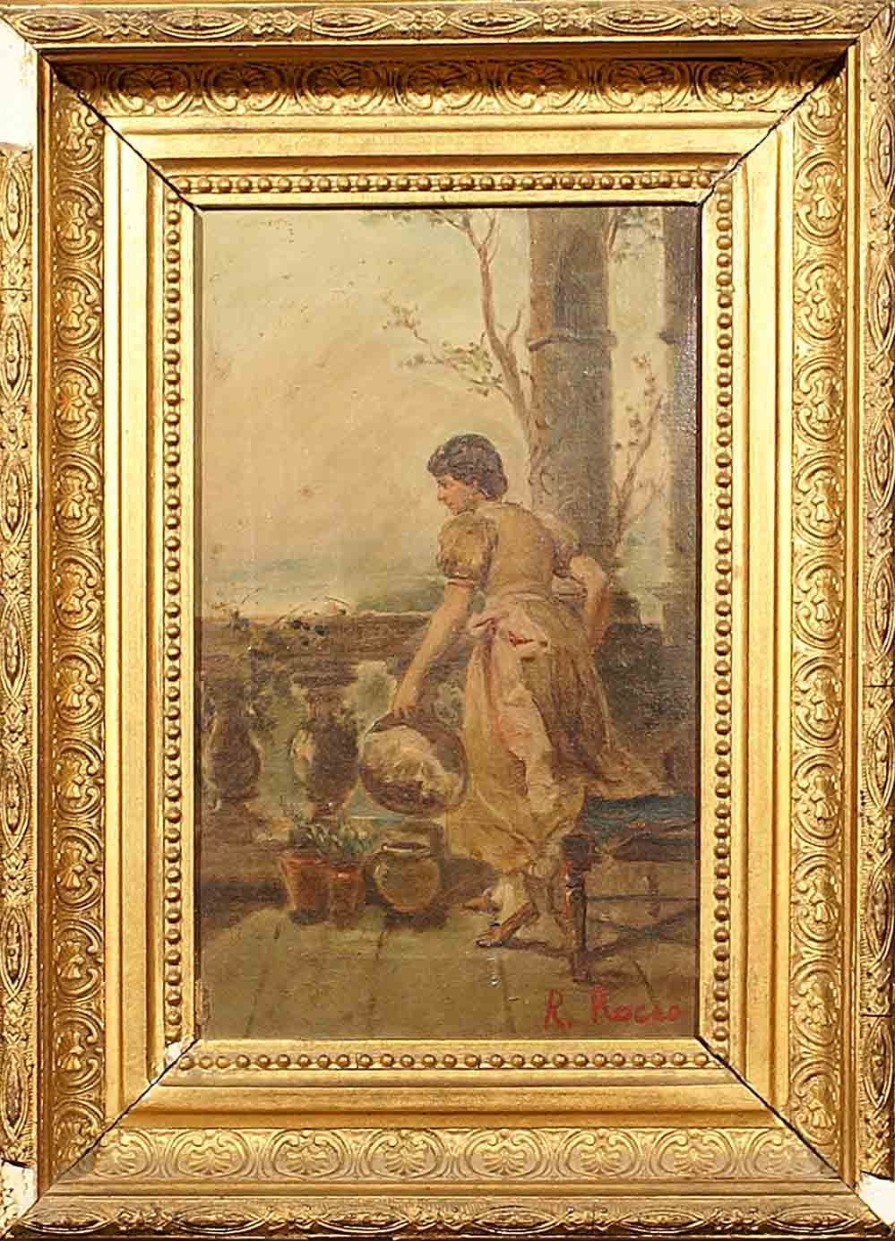R. Rocco (XX secolo), "Donna al balcone", olio su tela, cm. 29x18, firmato in basso a destra.