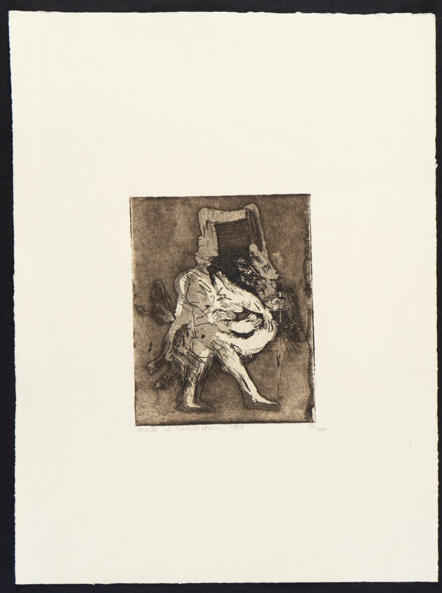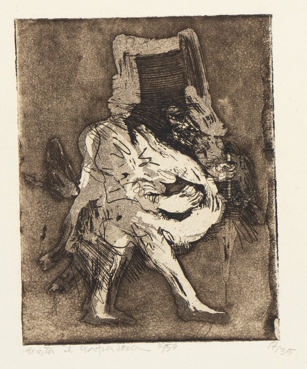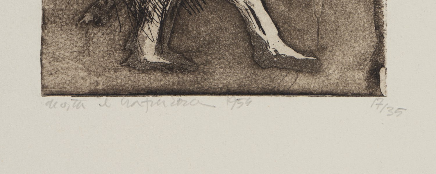 Luciano De Vita (Ancona 1929 - 1992), “Senza titolo”, 1954. Incisione su carta, presenta firma, titolo e data in basso a sinistra, numero di tiratura in basso a destra 17/35, Lastra H cm 21x17