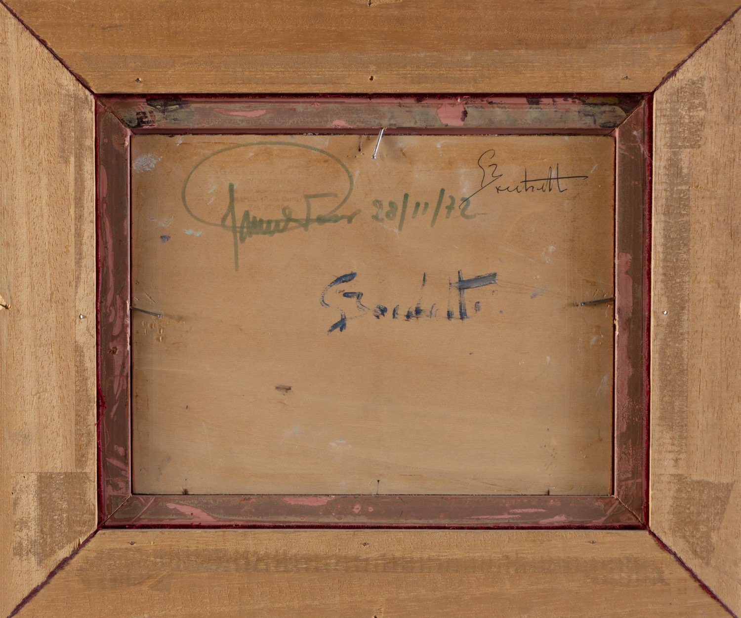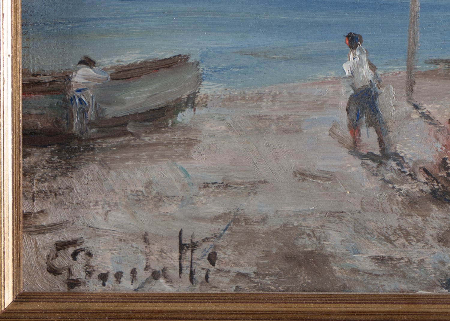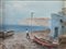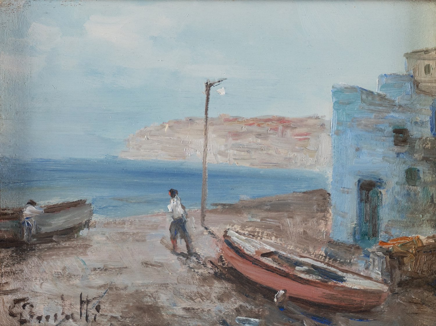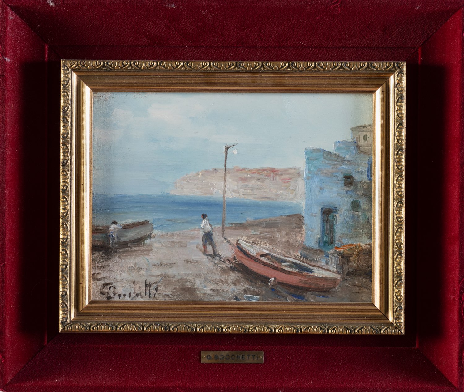 Gaetano Bocchetti (Napoli 1888 - 1992), “Scorcio con barche”, 1972. Olio su tavoletta, firmato in basso a sinistra, reca al retro firma, iscrizione con data e timbro della Galleria d’Arte Vittoriana - Napoli, H cm 8x24