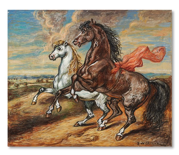 GIORGIO DE CHIRICO "Cavalli scalpitanti in un paese" metà anni '70 olio su tela