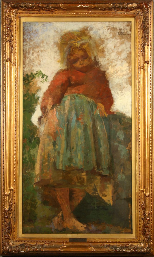 Firmato. NONO LUIGI - Nato a Fusina (Venezia) nel 1850. Morto a Venezia nel 1918. Sue opere sono custodite nelle Gallerie d'Arte Moderna di Roma e Venezia, nella Pinacoteca di Monaco di Baviera, nel Museo d'Arte Moderna Ca' Pesaro di Venezia e nel Museo Revoltella di Trieste. Dipinto olio su tela raff. ''BAMBINA IN POSA''. Firmato e datato 1881 in alto a destra. Con dedica. In cornice. Mis. Lung. cm. 46 Alt. cm. 89 ca.