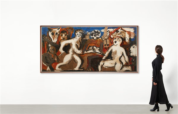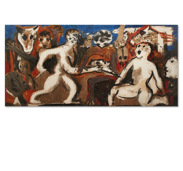 Enrico Baj "Battaglia" 1955 olio, tempera, collage, ovatta, stoffa cm 146x300 Fi