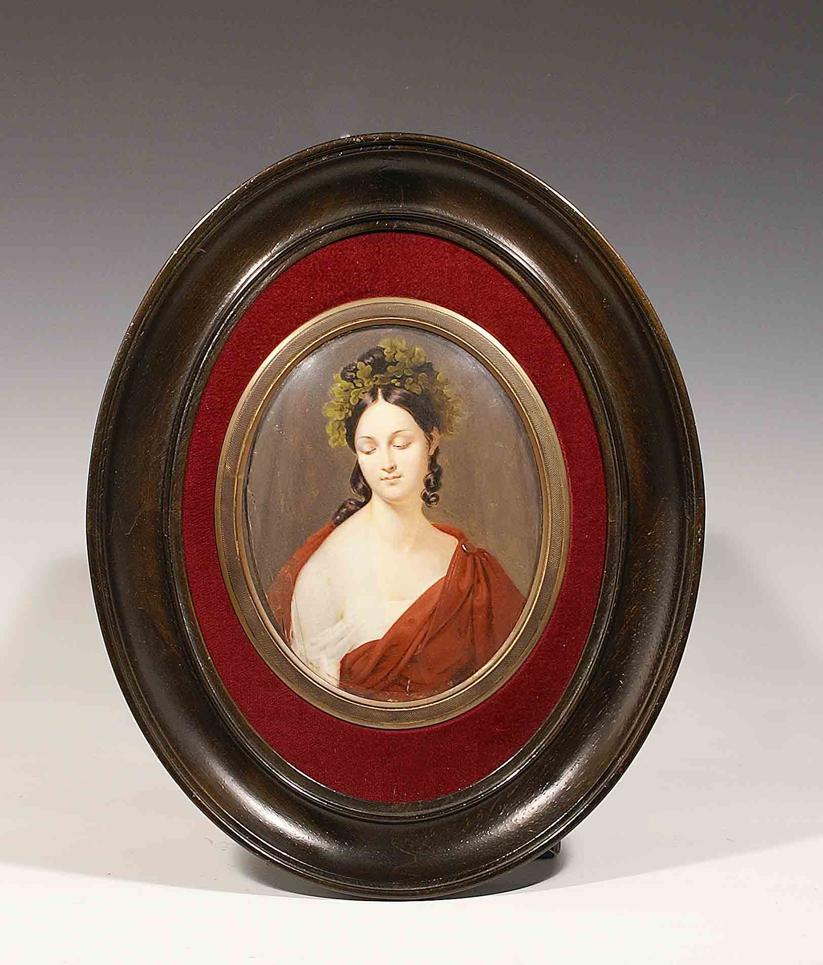 Scuola francese del XIX secolo, miniatura ovale dipinta su avorio raffigurante ritratto femminile, entro cornice in legno ebanizzato, firmata e datata, provenienza collezione Gianni Versace, cm. 9,5x11 (lievi difetti).