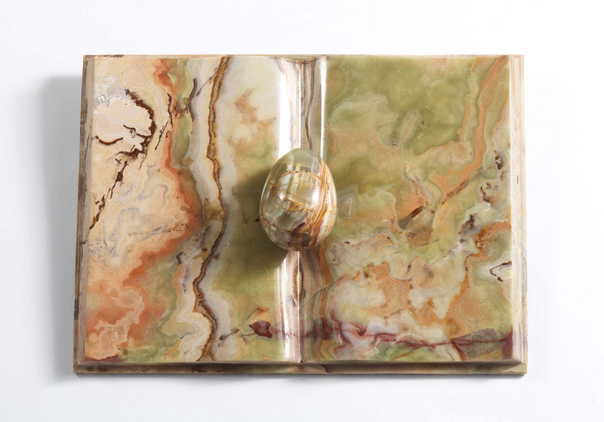 Libro e uovo in marmo, cm. 22 x 30 x 6
