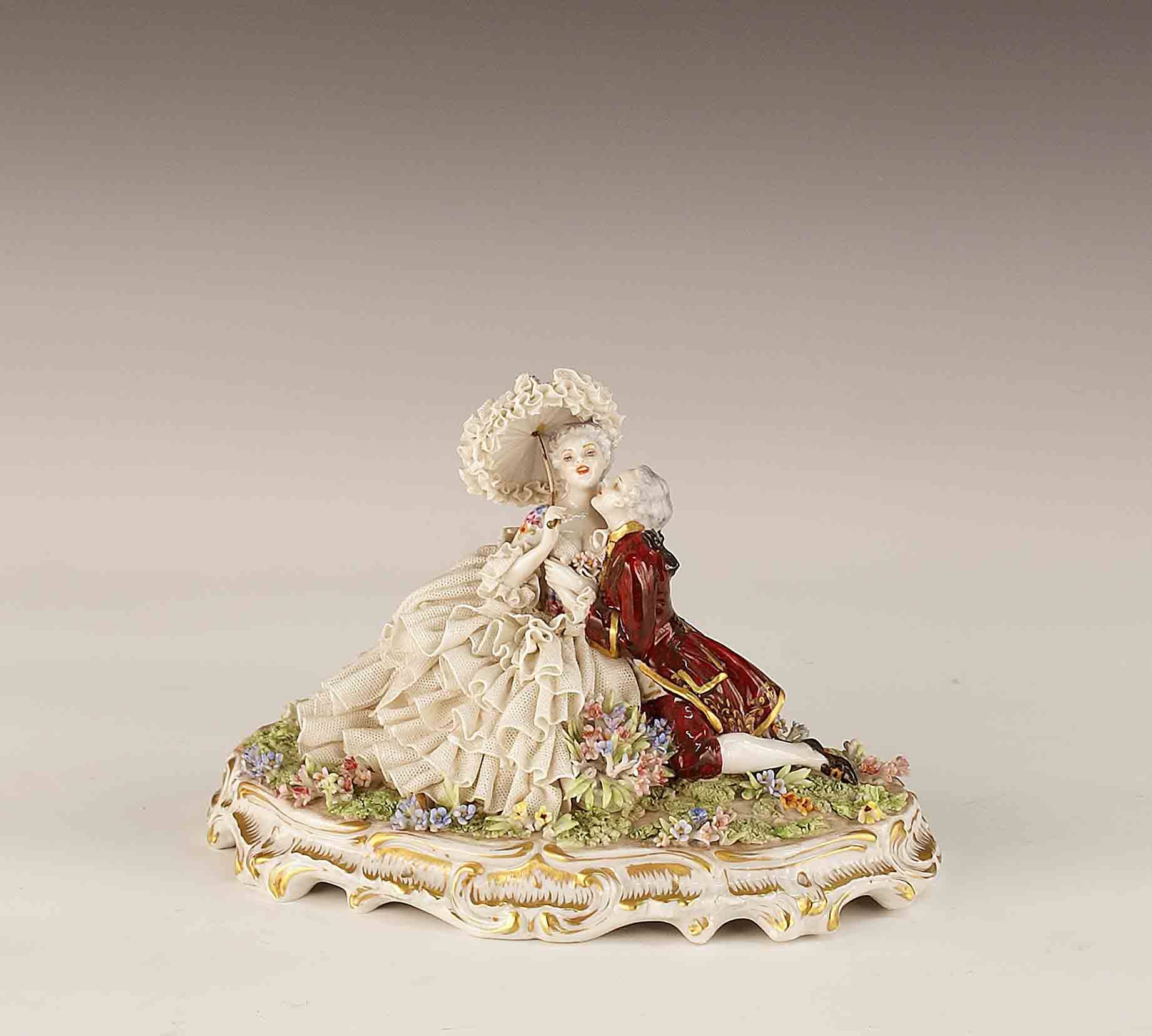 Luigi Fabris (Bassano del Grappa 1883 - 1952), gruppo in ceramica policroma raffigurante una scena galante, poggiante su base a rocailles, cm. 16x23, firmato sotto la base (difetti).