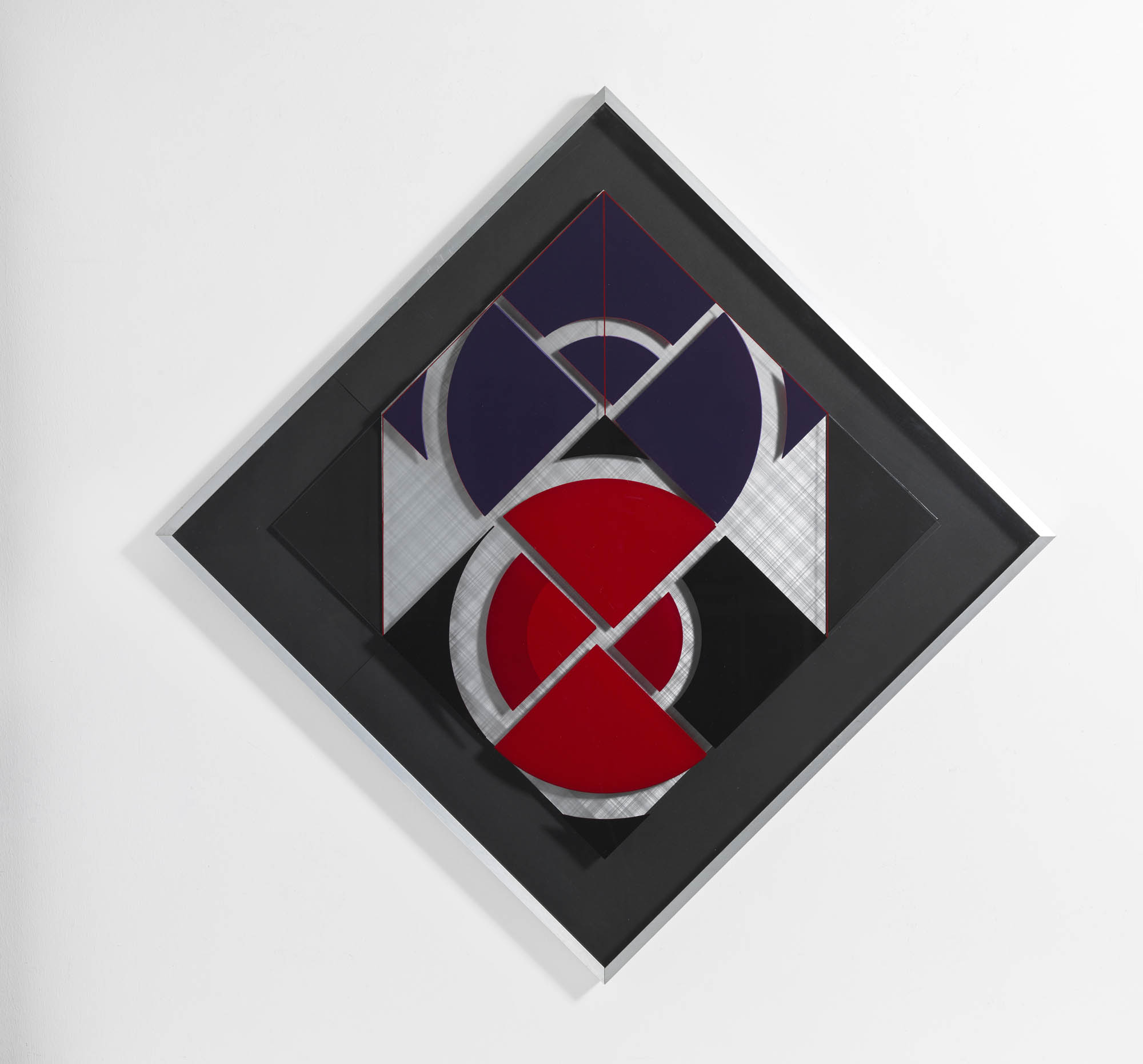 Assemblaggio,tecnica mista su tavola e plexiglas serigrafato, cm.80,7 x 80,7 x 5