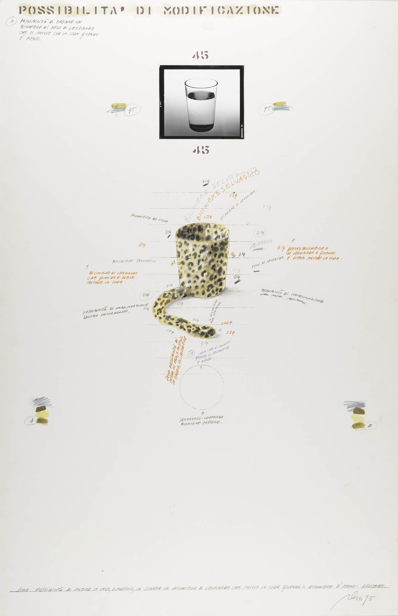 FABRIZIO PLESSI Sulla possibilità di avere in casa, o meglio, in gabbia un bicchiere di leopardo che muove la coda quando il bicchiere è pieno. Progetto, 1975