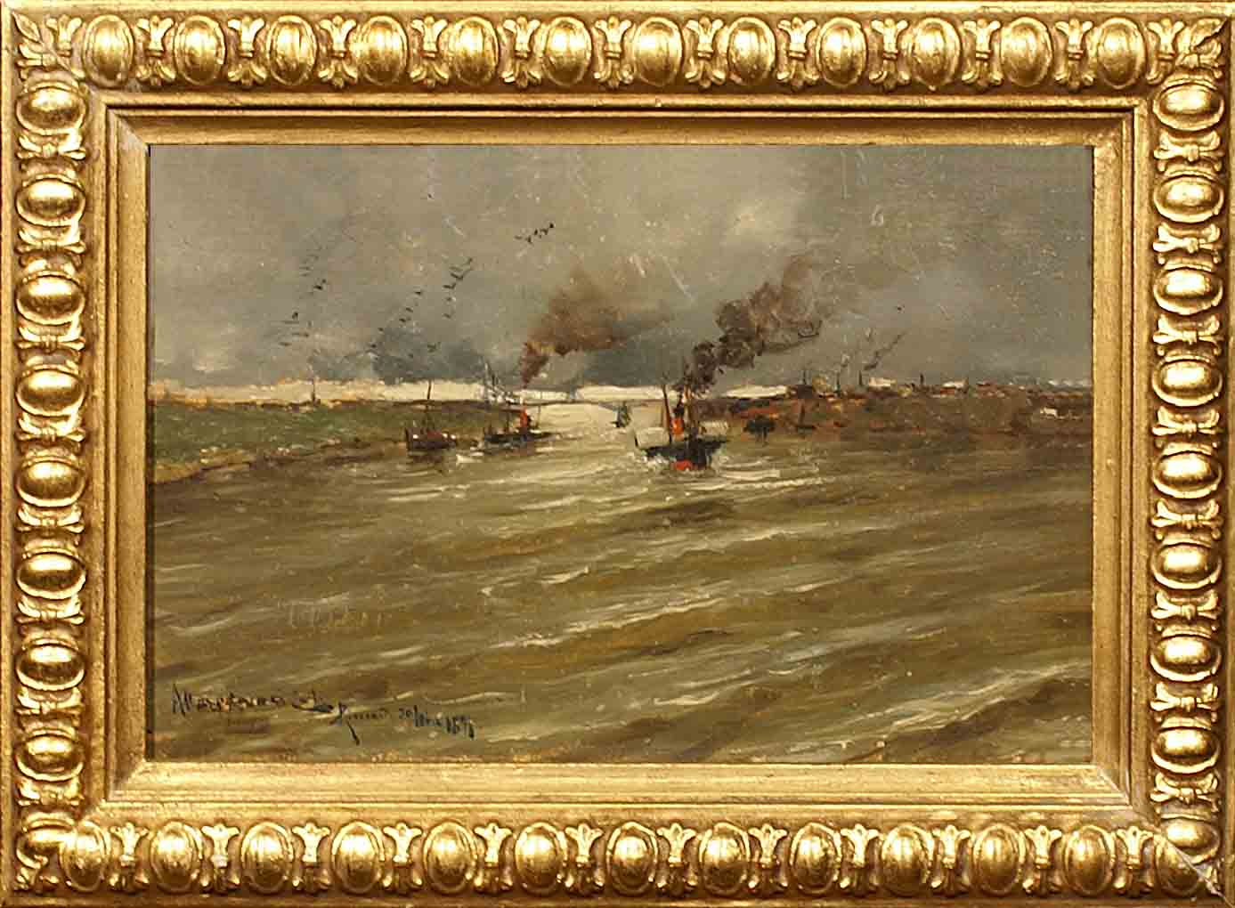 Oscar Ricciardi (Napoli 1864 - 1935), "Mareggiata", olio su tavola, cm. 16x25, firmato e datato 30 ottobre 1891 in basso a sinistra.