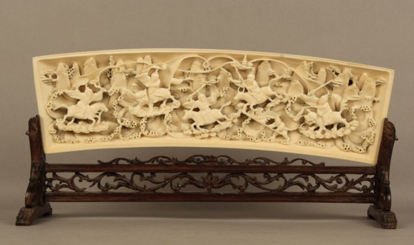 Firmato. Bassorilievo in avorio raff. ''SCENE DI BATTAGLIA''. Cina. Fine...