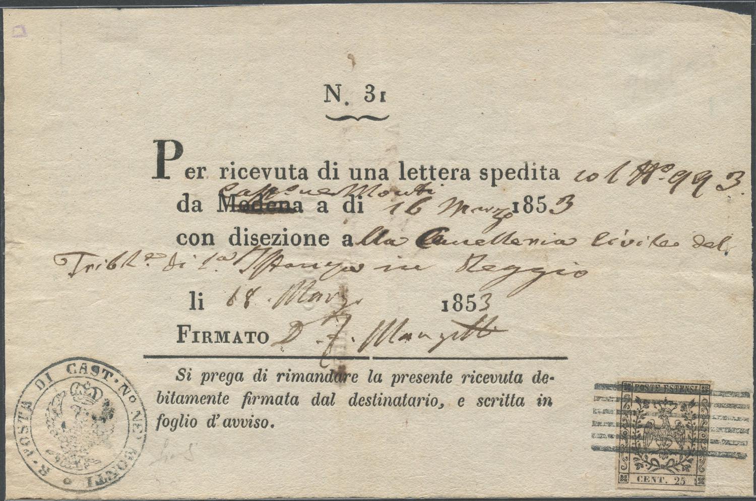 16.03.1853, ricevuta di ritoeno da Castelnuovo nei Monti per Reggio affrancata con un 25c, N.4 Camoscio Chiaro toccato in basso a destra. Sull'affrancatura il muto a sbarre di Castelnuovo Nei Monti(R1). (A-)