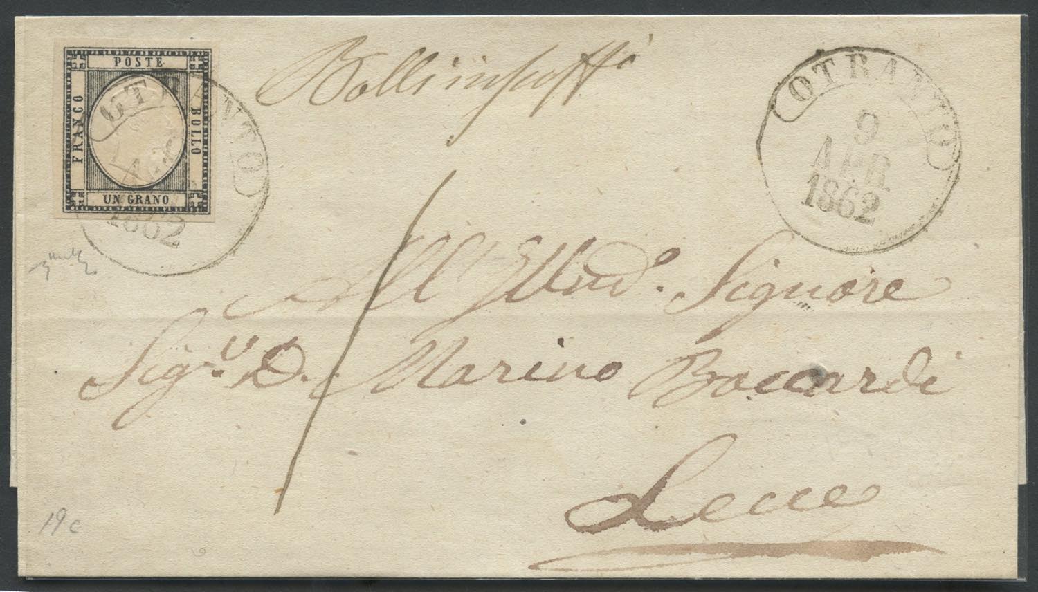 9.03.1862, Lettera da Otanto per Lecce affrancata tramite 1gr. Nero Intenso...