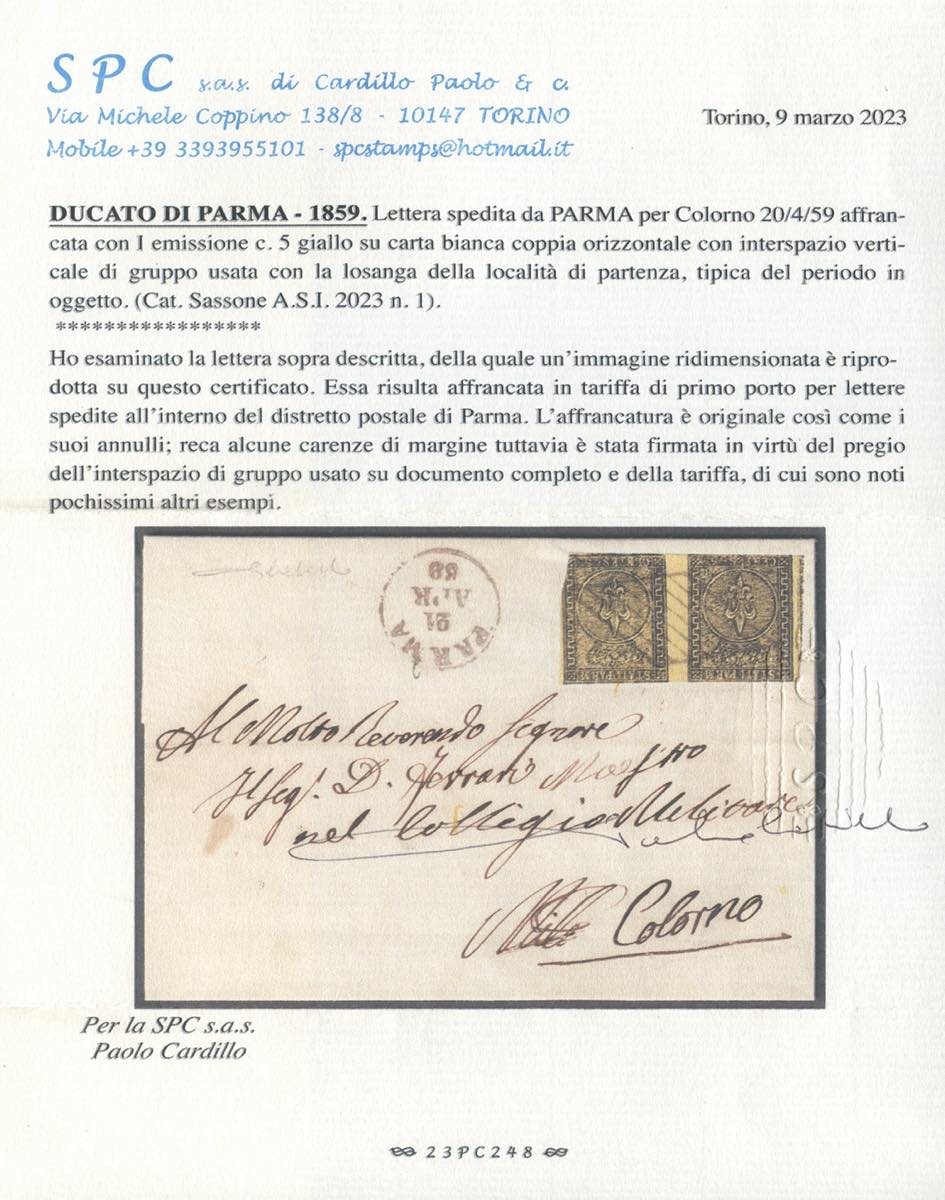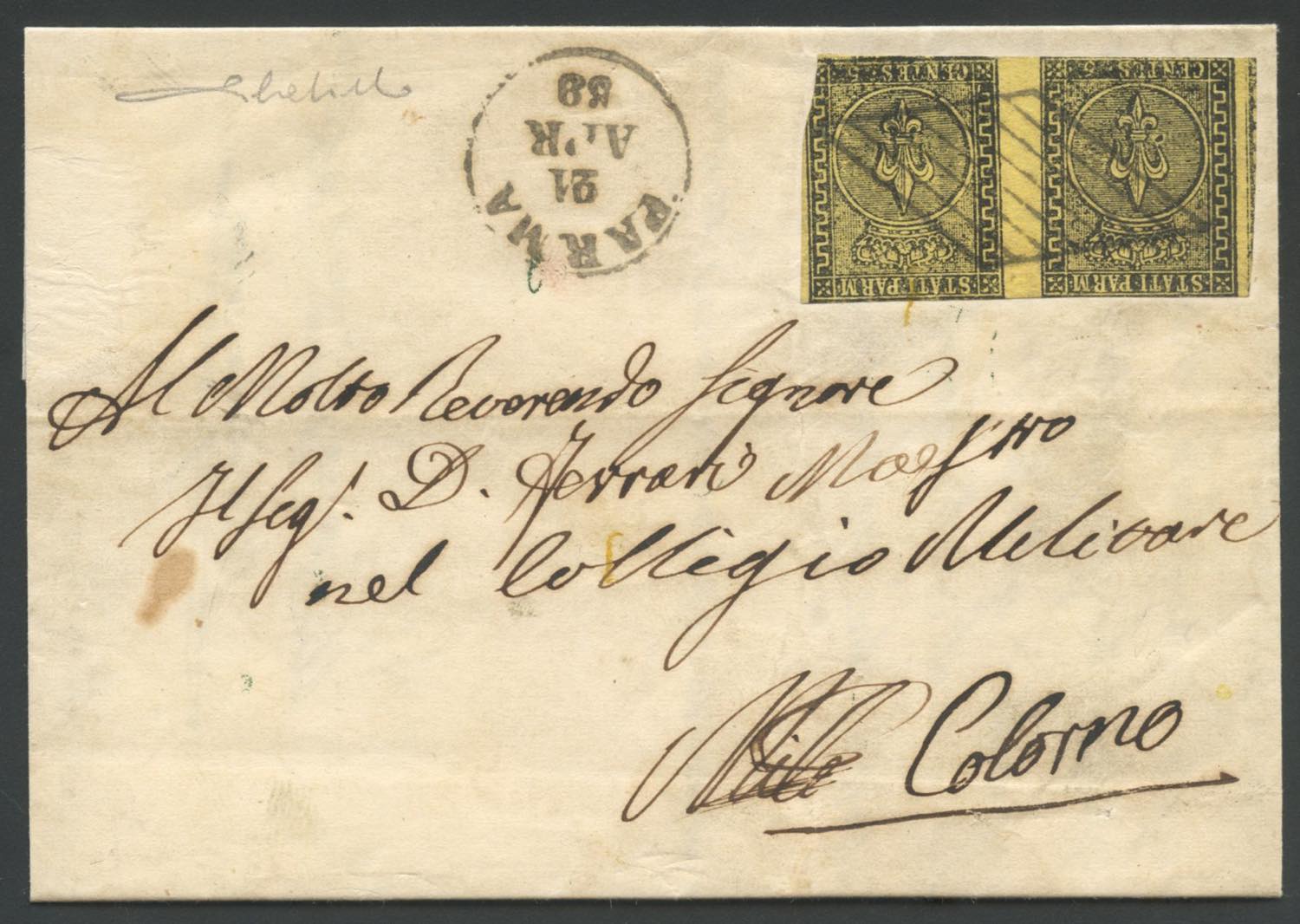 21.04.1859, Lettera spedita da Parma per Colorno affrancata per 10 centesimi, tariffa per lettere inviate all'interno del distretto, tramite una coppia del 5c. N.1 con interspazio di gruppo. (B) (Cert. Cardillo)