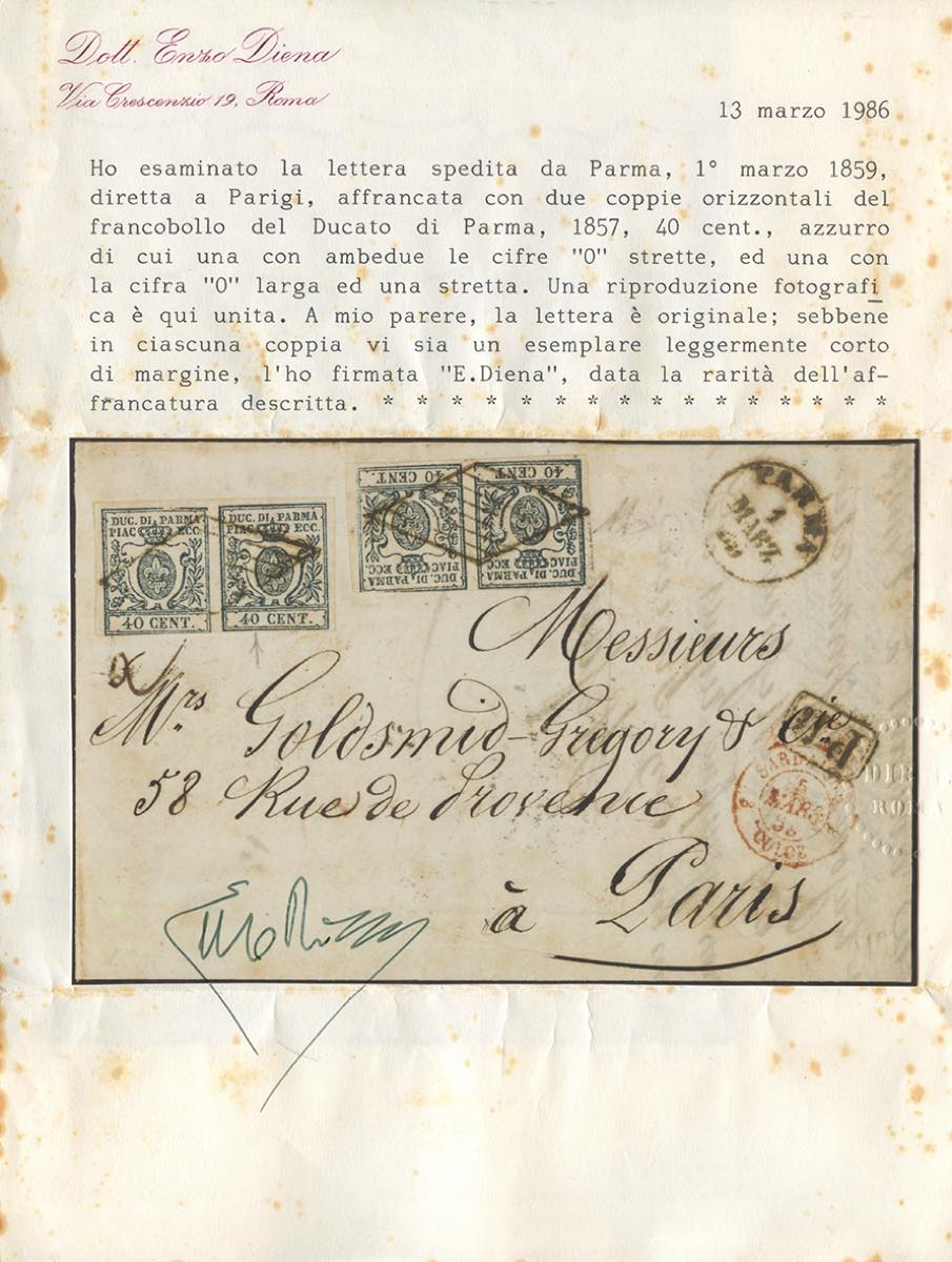 Lotto 73 | 01.03.1859, Lettera da Parma per Parigi affrancata con due coppie del 40c....