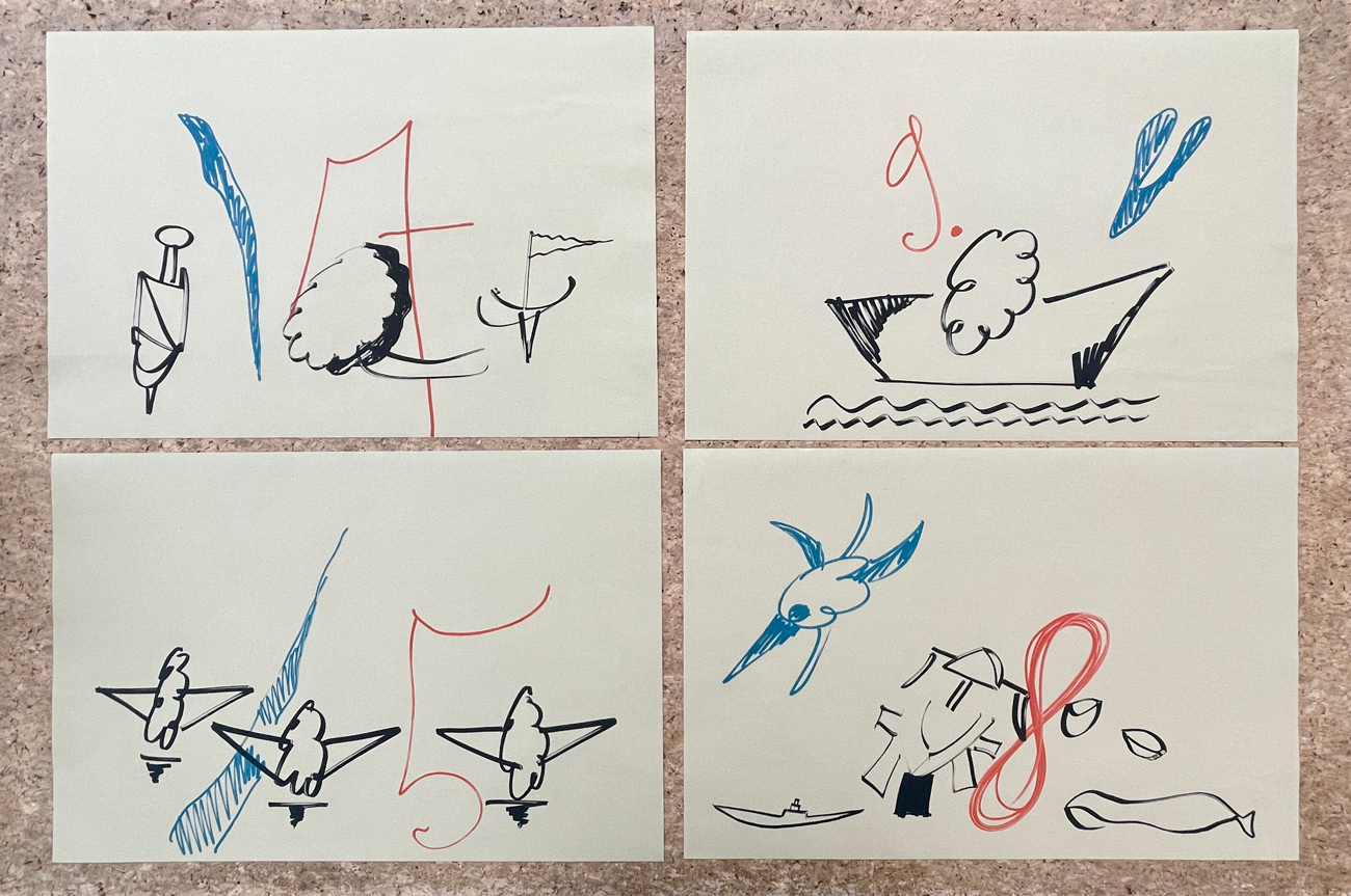 Cartella contenente 2 pagine di presentazione e 9 'tavole nautiche' sciolte di Sergio Dangelo, litografate a colori, 'poste in cantiere' da Giancarlo Migliavacca