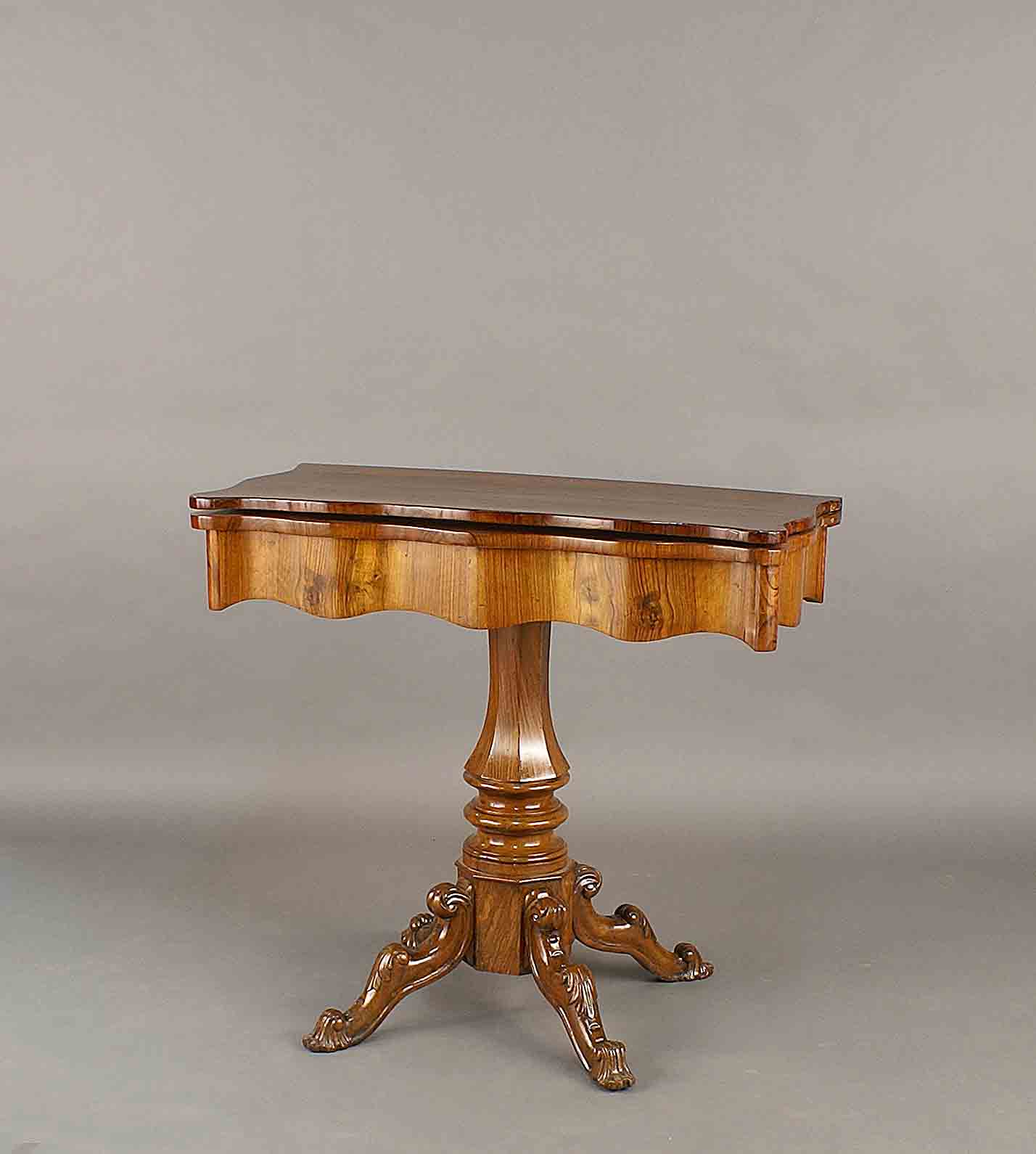 Tavolo da gioco in noce, piano sagomato apribile poggiante su base a...
