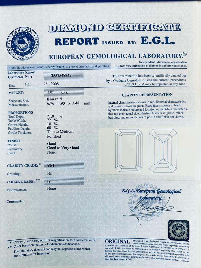Lotto 159 | DIAMANTE 1,05 CT D - VS1 - TAGLIO SMERALDO - CERTIFICATO EGL - DH30107