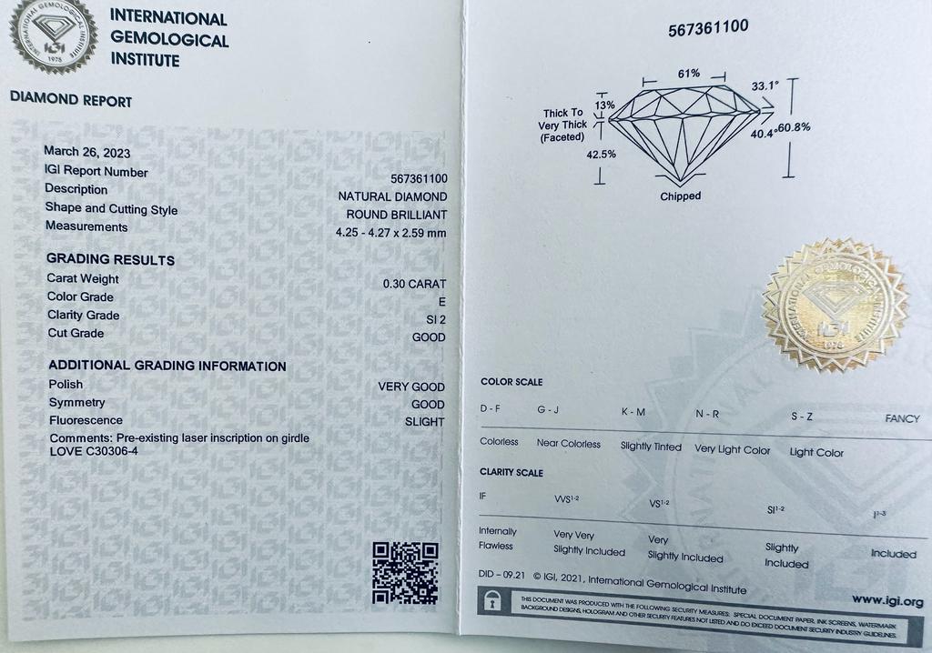 DIAMANTE 0,3 CT E - PUREZZA SI2 - TAGLIO BRILLANTE - CERTIFICATO IGI+ BLISTERATO + INCISO AL LASER - C30306-4-LC