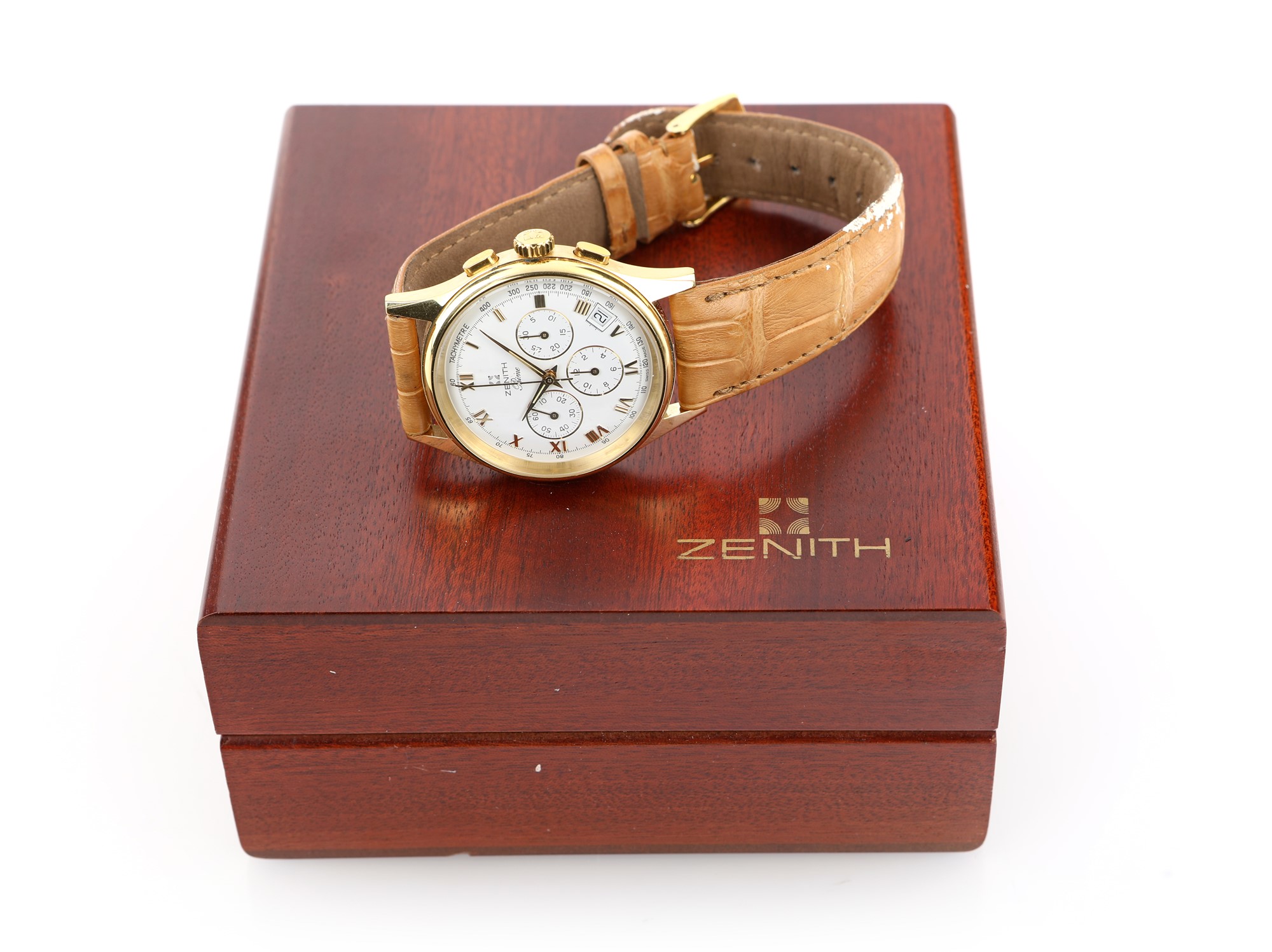 Orologio da polso Zenith con cassa in oro giallo 18kt e doppio vetro zaffiro con fondello a vista. Movimento meccanico a carica manuale con cronografo e calendario cal. 420. diametro 38mm