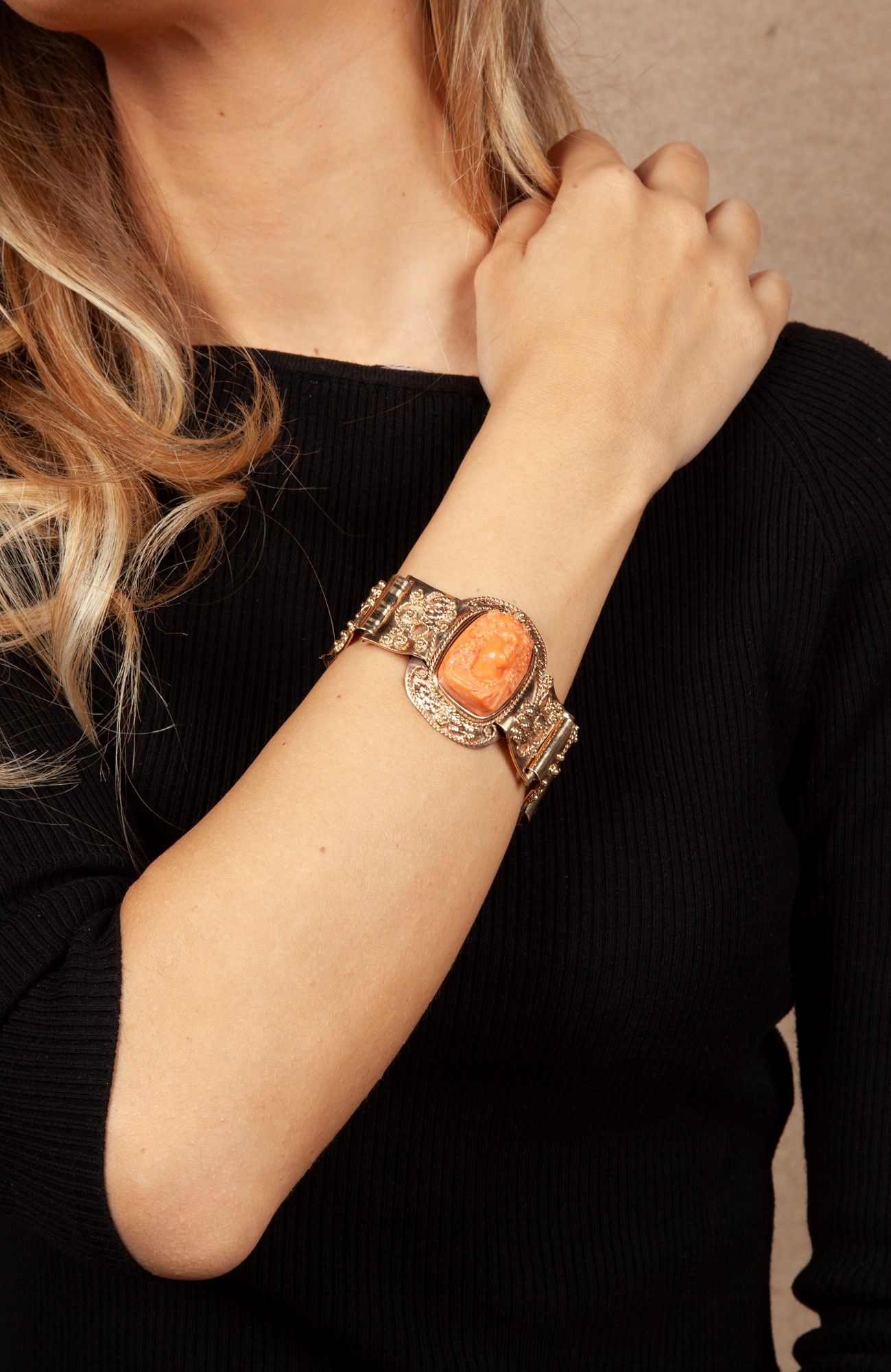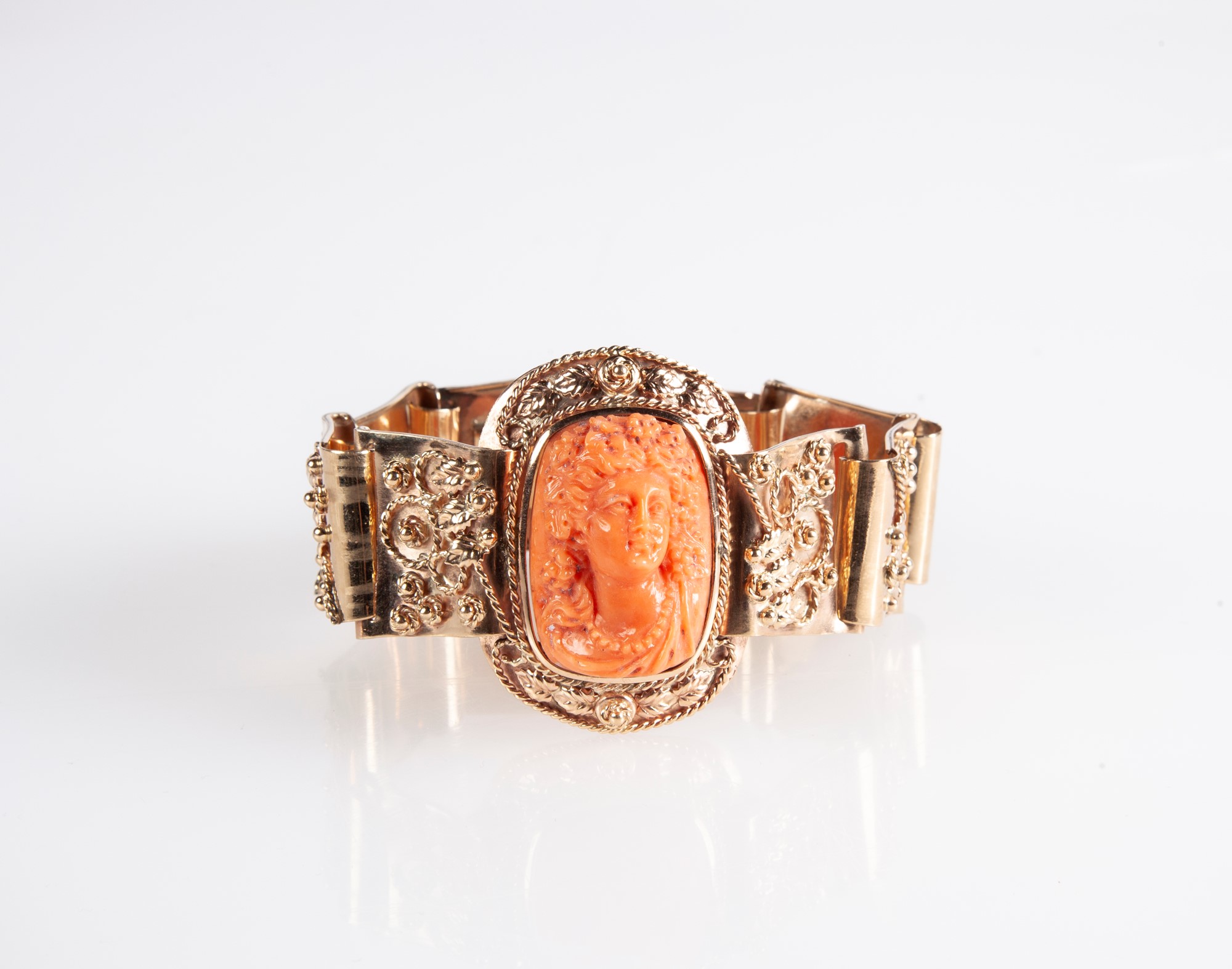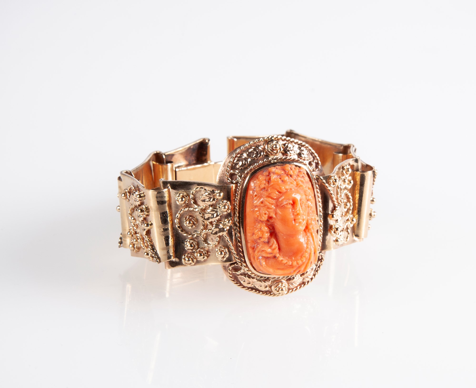 Lotto 227 | Bracciale in oro e cammeo in corallo cm 20 - elemento centrale cm 5x3,5